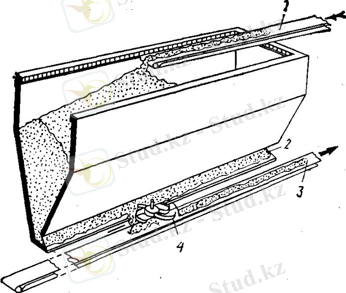 Сурет. 1. 6. Тік бұрышты науалы бункер: 1 - желқайықты конвейер; 2 - бункер астындағы тесік; 3 - төменгі конвейер; 4 - жылжымалы роторлы қоректендіргіш