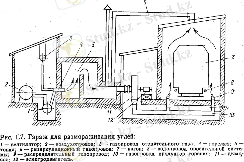 Жану өнімдері жанарғыдан 5 түтінсорғышпен 11 таратып тұратын теміржолдың екі қабатында орналасқан гараждың жайларының төменгі жағындағы газ құбырларына 10 бағытталады. Кейбір гараждарда вагон доңғалақтарының подшипниктерін су құбырын-дағы 8 сумен шаяды, бірақ соңғы кезде бұл қолданылмайды, дегенмен гаражда темпера-тураны 70 °С деңгейінде ұстайды .