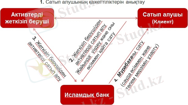 - Клиент Ислам банкіне активтерді алып сату бағасы бойынша қаржыландыру үшін жүгінеді. Ислам банкі Клиенттің өтінімін сұралып отырған активті сатып алу туралы оң/теріс шешім қабылдау үшін мұқият зерттейді.