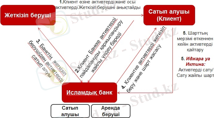 - Жеткізуші Ислам банкіне активті жеткізуді жүзеге асырады. Ислам банкі Иджара мәмілесінің негізінде Клиентке белгілі мерзімге қолдану үшін сатып алған активін ұсынады. Клиент қолданатын активіне жалға алу төлемдерін жүзеге асырады.