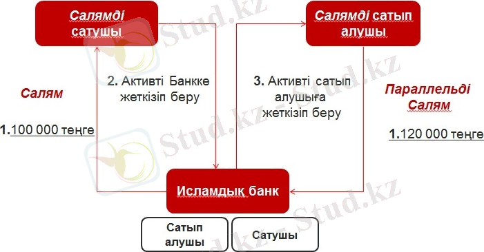 - Клиент (Салямды сатушы) Салям банкімен активтің келешектегі жеткізілу күнінің ағымдағы бағасымен белгілі активке Салям мәмілесін жасайды. Салямның аталған шартына параллельді Ислам банкі басқа Клиентпен (Салямды сатып алушымен) активтің келешектегі жеткізілу күнінің үстеме сауда бағасы бойынша шарт жасасады.