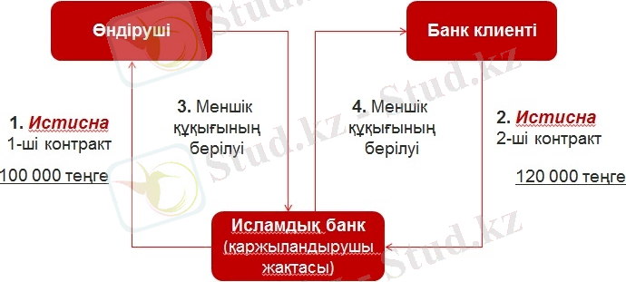- 2-Истисна келісімшартына сәйкес Клиент Ислам банкіне тапсырылатын өнімді дайындау үшін ақшалай қаражатты кезеңмен аударады. Ислам банкі өз кезегінде, 1-Истисна келісімшартының талаптары бойынша Өнім өндірушіні кезеңмен қаржыландыруды жүзеге асырады.