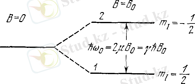 2 сурет. I=1/2 спинді ядролардың B 0 тұрақты магниті өрісіндегі энергетикалық деңгейлердің ыдырауы.