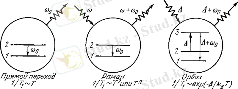 4б. сурет. 2 →1 өтуіне жауап беретін спинді релаксация процессінің жүйесі. Сол жағында- фонон шашырауымен сүйемелденетін процесс(тура ауысу) . Ортасында- фононның раманов шашырауымен байланысты процесс; оң жағында- екі этапта жүретін(Орбах бойынша) фононның шашырауы процессі. Т 1 бойлық релаксацияның уақыттық температуралық тәуелделігінің типі әр процесстің төменінде көрсетілген.