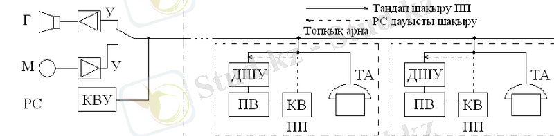 Таратушы станцияда РС орналастырылады, түймелік шақырушы құрылғы (КВУ) және микрафоны (М), дауысзорайтқыштан (Г), күшейткіштен (У) тұратын сөйлесу приборлары. Әр-бір ПП аралық пунктте шақыру тұрақты приборлары дишефраторлық құрылғы ДШУ және ПВ шақыру қабылдағышынан тұрады. Телефон аппатарттары желіге паралельді қосылады. ПП Жағынан таратушы станцияның шақыруы дауыс арқылы жүзеге асырылады. (1. 2. 2. -сурет) .