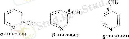 Монометилпиридиндерді-пиколиндер, диметилпиридиндерді-лутидиндер, үшметилпиридиндерді-колдидиндер деп атайды. Метилпиридиндерді пиколиндерді толығырақ қарастырайық. Ол α-, β-, ﻻ -пиколин түрінде болады.