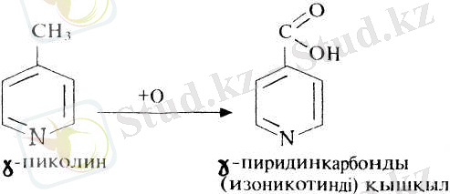 Сондай-ақ, α -пиколин тотығып, α -пиридинкарбонды (пиколинді), ал β -пиколин - β -пиридинкарбонды (никотинді) қышқылды түзеді. Пиридин ядросы кейбір алкалоидтың молекуласында, мысалы никотинде, сол сияқты РР дәруменінін молекуласында β -ниридинкарбонды қышқылдын амиді түрінде болады.