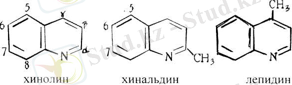 . Оны α-, β-бензопиридин немесе α-жағдайындағы СН тобы азот атомымен алмасқан нафталин ретінде қарастыруға болады. Оның кейбір гомологтарын ескі атау бойынша атайды: 2-метилхинолинді - хинальдин, 4- метилхинолинді-лепидин дейді.
