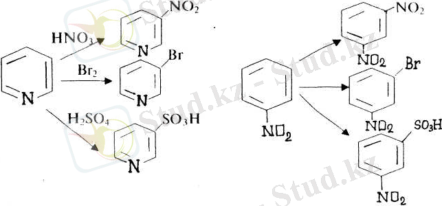 Пиридин қатаң жағдайда, нашар шығыммен өзінің β-жағдайы бойынша нитрленеді, сульфирленеді және бромданалы. Бұл реакция нитробензолдағы орынбасуға ұқсас: