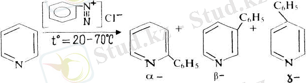 Енді радикалды орынбасу реакциясын алайық. Пиридин-диазоний тұзынын С6Н5СІ судағы ерітіндісін косып 20-70°С қыздырған кезде, α -, β -және ﻻ арилпиридиннің қоспасы түзіледі: