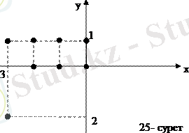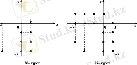 R және R -1 сәйкестіктерін тік бұрышты координаталар системасында кескіндегенде олардың графиктері өзара қандай байланыста болатынын анықтайық. Х={-3, -2, -1, 0} және У={0, 1, -2} жиындарының арасындағы ²хÎХ саны уÎУ санынан аз² деген R сәйкестік бар болсын. Сонда R сәйкестігінің графигі {<-3, 0>, <-3, 1>, <-3, -2>, <-2, 0>, <-2, 1>, <-1, 0>, <-1, 1>, <0, 1>} болады да, тік бұрышты координаталар системасында 25-суретте көрсетілген сегіз нүкте болады.
