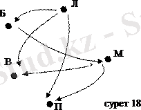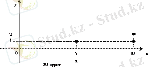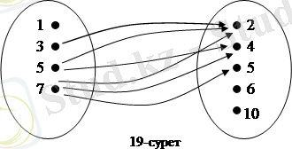 Шынында да егер R Х={1, 3, 5, 7} және У={2, 4, 6, 8, 10} жиындарының арасындағы ²х саны у санынан үлкен² сәйкестік болса, онда 7ÎХ элементіне У жиынының үш элементі сәйкес келеді: 7R2, 7R4, 7R6. Графта (19-сурет) 7 санын өрнектейтін нүктеден үш стрелка шығатындығы көрініп тұр. 3ÎХ элементіне У жиынын тек қана бір элементі 2 сәйкес келеді. Графта 3 санын өрнектейтін нүктеден бір ғана стрелка шығады. Ал 1ÎХ элементіне У жиынының бірде-бір элементі сәйкес келмейді, сондықтан да графта оны өрнектейтін нүктеден ешқандай стрелка шықпайды.