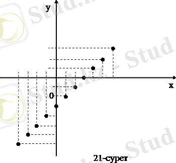 Х=У=Zжәне R-Х және у жиындарының арасындағы ²х саны у санынан 3 саннына артық² деген сәйкестік болсын. Тік бұрышты координаталар системасында осы сәйкестіктің графигін салайық. Графикке тиісті жұптардың жиыны шектеусіз, олай болса, біз координаттық жазықтықта абсциссасы бүтін сан, ал ординатасы абсциссасынан 3 бірлікке кем болатын нүктелердің шектеусіз жиынын аламыз. Біз графиктің тек қайсыбір бөлігін ғана құра аламыз, мысалы, мынадай <1, -2>, <0, -3>, <5, 2>, <10, 7>, <-3, -6> нүктелерді (21-сурет) . Осы нүктелердің барлығы бір түзу бойында жатады.
