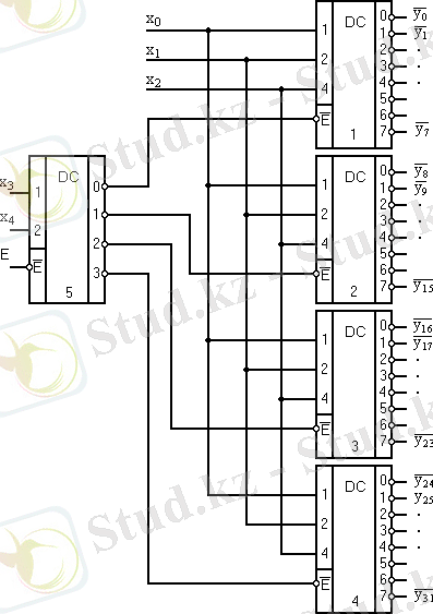 Стробтаушы кірістің бар болуы қажетті жағдайда бірнеше дешифратор микросхемасы негізінде кіріс кодасының разрядтылығын өсіру мақсатында дешифраторлы бұтақ құрылымын өсіруге болады (3-сурет) .