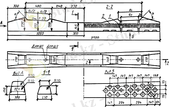 Колеясы 1520 мм темір жолға арналған алдын-ала кернеуленген темірбетонды шпалдар, 1-1 орта қимасы.