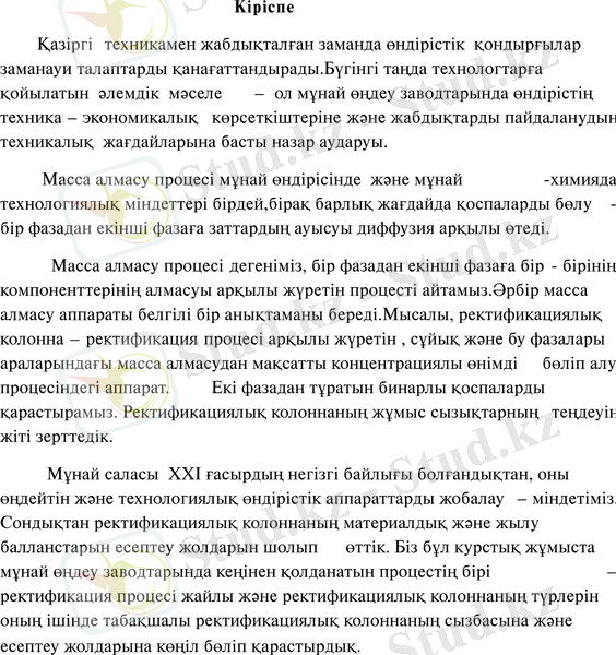 Сұйық қоспаларын ықшамды ректификациялық колонналарда толық ажырату экономикалы тиімді. Ректификация процесі өзара тепе - теңдікте емес сұйық және бу фазаларының ағындарын бірнеше рет жанастыру арқылы өткізіледі. Бұл фазалардың көбірек жанасуының арқасында бу ТҚ- мен, ал сұйық ЖҚ- мен байытылады.