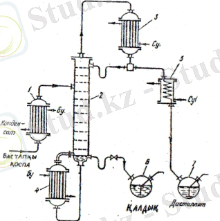 Мұндағы: 1-ысытқыш; 2-ректификациялық колонна; 3-дефлегматор; 4-қайнатқыш; 5-суытқыш; 6-кубтық қалдықты жинағыш; 7-дистилляттыңжинағышы; 8-флегма бөлгіш