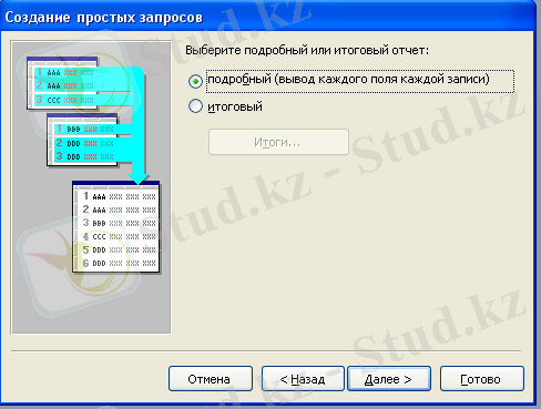 Сұхбаттасудың екінші қадамында (2. 12-сурет) сұраныстың қандай болатыны - жазбалардың барлығы шығарылатын толық (подробный) па, әлде нәтижелік (итоговый) пе, сол көрсетіледі. Содан подробный батырмасын басып Келесі (Делее) түймешігін басу керек. Басқаннан кейін сұранысқа ат беру терезесі шығады.