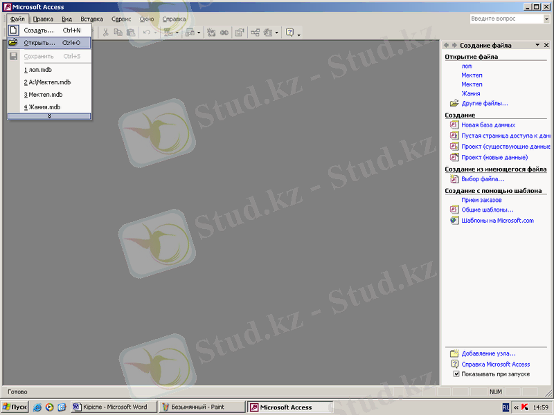 Пуск→Программалар→Microsoft Access командалрымен орындалады немесе жұмыс үстеліндегі Access белгішесін екі рет шерту қажет. 2. 1-суретте мәліметтер базасын ашуға мүмкіндік беретін терезе көрсетілген.