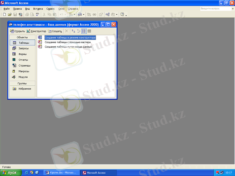 Мәліметер терезесі ашылады. Сол терезеден Кестелер батырмасын басып мәліметтерді енгізуге болатын, конструктор режимін таңдаймыз. Осы конструктор режимін екі рет шерткен кезде кесте шығады. Бұл кестеге мәліметтер бағаналарын енгіземіз. Енгізіп болғаннан кейін деректер қоры ашылады. Осы деректер қорына өзіміздің мәліметтерімізді енгізем.