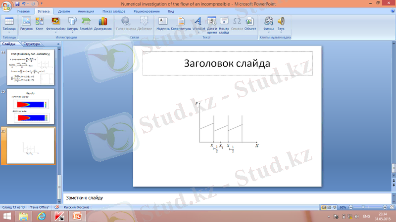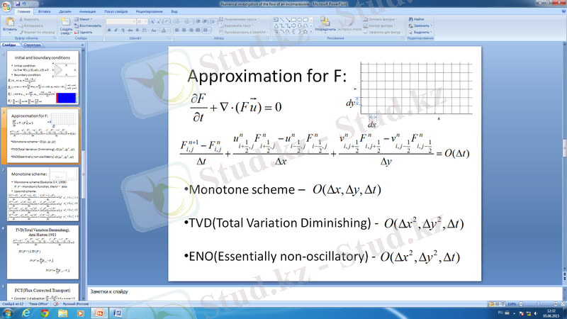 Мен бұл өндірістік практика барысында екі араласпайтын және сығылмайтын сұйықтардың канал бойындағы қозғалысы үшін Навье - Стокс теңдеуін жазып және оны жоғары ретті дәлдікпен сандық әдістермен зерттеу жолдарын: монотонды схема (upwind), FCT(Flux Corrected Transport) және ENO(Essentially non - oscillatory) схемаларын қарастырдым. Монотонды схема тек бірінші ретті дәлдікпен есептегендіктен онда сандық диффузия пайда болатынын байқадым. ENO(Essentially non - oscillatory) схемасы екінші ретті дәлдікпен есептегендіктен салыстырмалы түрде шешім дәлірек болатынын көрдім.