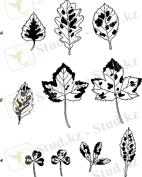1 сурет. Өсімдіктердің күкірт диоксидімен зақымдануының қарапайым белгілері: а - ақ қайың, емен, орман бұршағы жапырақтары; б - георгин және үйеңкі жапырақтары; в - беде, жоңышқа, рапс жапырақтары.