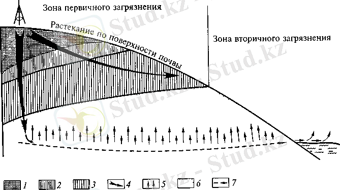 2 сурет. Шикі мұнаймен ластану моделі: 1 ластану зонасы -мұнайдың ауыр фракцияларының тұнуы, 2 - жеңіл фракциялардың тұнуы, 3 -мұнайдың жеңіл фракцияларының және минералданған сулардың жинақталуы, 4 - мұнай миграциясының бағыты, 5 - грунт сулардың үстіндегі қабықшадан мұнайдың түсуі, 6 - грунт сулар деңгейіндегі екінші ластану зонасы, 7 - грунт суларының деңгейі.