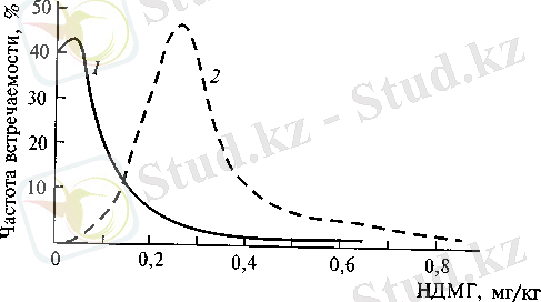 3 сурет. Орталық Қазақстанда зымырандарды ұшыру аймақтарының топырағы (7) мен өсімдіктеріндегі (2) симметриялық емес диметилгидразин концентрацияларының таралуы ( Н. С. Касымов бойынша, 1994)