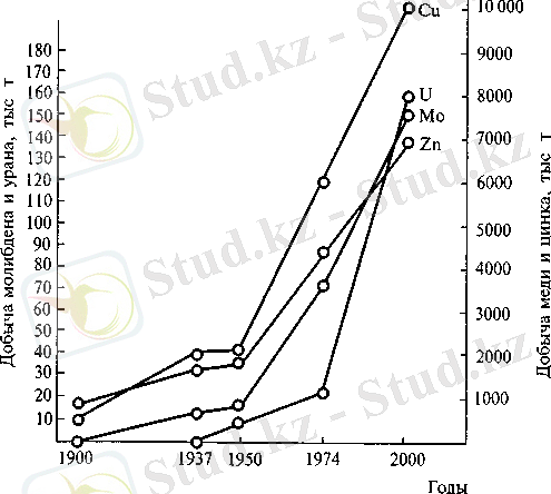 Графикте 20 ғ-да өте ертеден өндіріліп келе жатқан мыс рудасының, молибден және уран рудаларының өндірілуі көрсетілген.