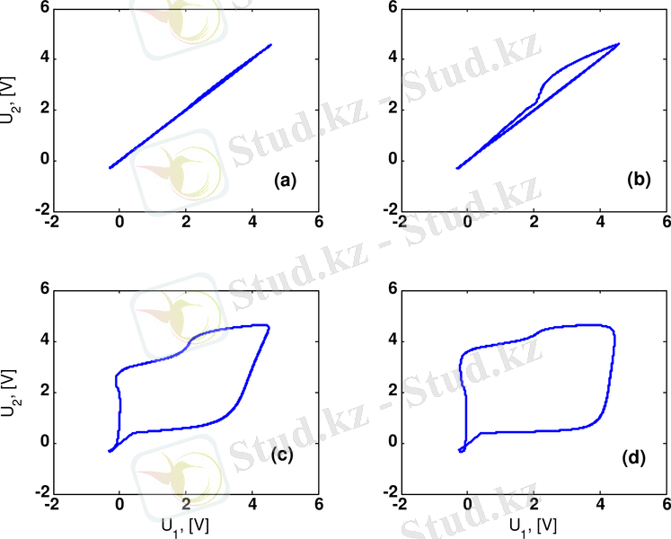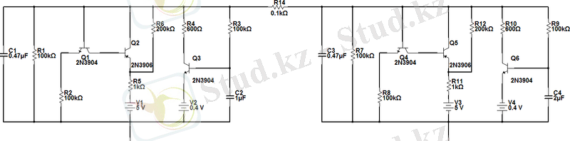 2-суретте байланысқанға дейінгі және байланыстан кейінгі тербелістердің кескіні көрсетілген. Суреттен көріп тұрғанымыздай байланысқа дейін осцилляторлардың тербіліс периодтары өзгеше болып, T 1 =0. 036 c T 2 = 0. 064 c құраған болса, ал байланыстан кейін осцилляторлардың өзара синхрондалғандығын көруге болады. Олардың тербіліс периодтары теңеліп, T s =0. 044 c құрады. Схемотехникалық эксперименттердің бірінші кезеңінде индивуалды осцилляторларды бір-бірінен өзгешелендіру үшін С2 және С4 конденсаторлардың мәні бір-бірінен 2 есе өзгеше етіп алынды. Осцилляторлардың барлың басқа параметрлері тұрақты. Эксперимент барысында сондай-ақ, толық синхрондық күйдің байланыс параметрінің кемуіне байланысты жартылай синхрондық күйге өтуі байқалды (3-сурет) . Байланыс параметрінің мәнін 1 ден 950кОм-ға дейін өзгерту кезінде бірдей фазада синхрондалып тұрған екі осциллятор қарам-қарсы фазадағы синрондалу күйіне өтеді (4-сурет) .