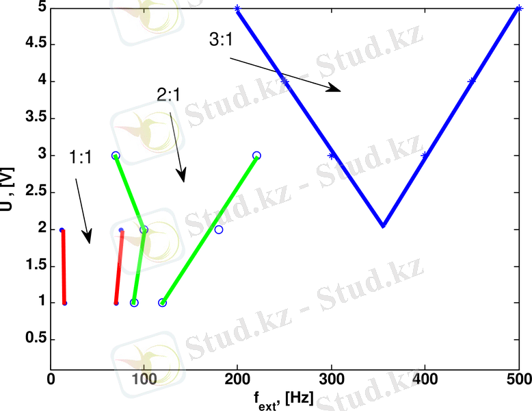 Алынған мәліметтер MatLab ортасында өңделді. Эскперименттер барысында дәстүрлі 1:1 ретті синхронизация тілінен бөлек жоғарғы ретті 2:1, 3:1 ретті тілдердің орын алу аймақтары анықталды. 10-суретте Арнольд тілдерінің бейнесі көрсетілген. Жоғары ретті синхронизация тілдері сыртқы күш жиілігінің айтарлықтай жоғары мәндерінде байқалады. Сондай-ақ, релаксациялық осцилляторларға тән мынадай заңдылықтар да анықталды: