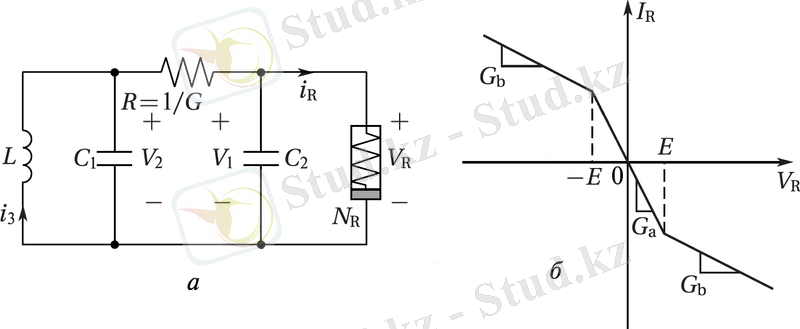 . h(x) сипаттамасы үшін келесі параметрлер мағынасын таңдаймыз: a=-0, 143, b=0, 286. (1. 23) теңдеуінен көрініп тұрғандай, а<0 шарты Ga>G білдіреді. Осы жағдайда кері өткізгіштің көзі көп болады, тізбектің активті өткізгіштігіне қарағанда b>0 шарты Gb<G және RLC-тізбегіндегі активті шығындар көп, тізбектің кіру көзіне қарағанда. Өшпейтін тербелістерді орнату үшін кері мен оң шығын арасындағы орташаландырылған баланс қажет. Демек, маңызды қорытынды жасауға болады: жүйенің (1. 23) әр фазалық траекториясы