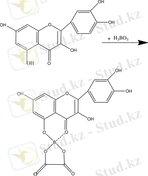 Металл ионымен флавоноидтар А және Б комплексті қосылыстар түзеді. А сақинасындағы комплекс С 5 -ОН, С-сақинасындағы С=0 топ және С 3 -ОН топтар арасында түзеді.