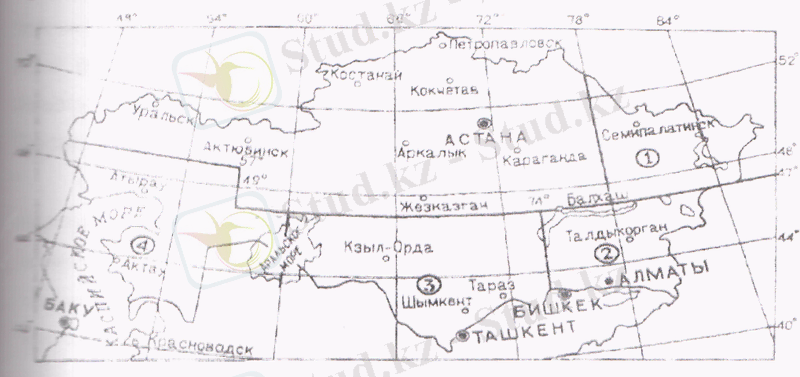 1 - Тарбағатай-Алтай, 2 - Жоңғар - Солтүстік Тянь-Шань таулары, 3 -Қаратау, 4 - Каспий жағалауы.