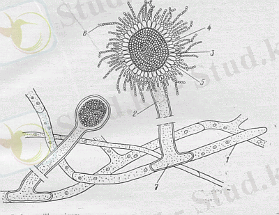 1 - гифтер; 2 - конидий түзуші өскін; 3 - көпіршік; 4 - бірінші қатар стеригмалары; 5 - екінші қатар стеригмалары; 6 - конидии; 7 - тірек клеткалары.
