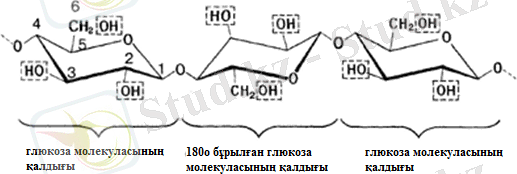 Әрбір глюкоза молекуласының қалдығы көрші молекулаға қарағанда 180 о бұрылған және онымен -О- оттекті көпірше арқылы гликозидтік байланыспен байланысқан. Осылай бүкіл молекула ұзын тізбек түрінде болады. Тізбектің әрбір бөлігі 6-буынды цикл түрінде болады. Осы 6-буынды циклдың конформациясы кеңістікте жазықтық бойымен түзу орналаспайды, ол целлюлоза молекуласы үшін ең тұрақты әрі қолайлы “кресло” конформациясына өтеді. Әрбір глюкоза қалдығында 3 ОН-гидроксил топтары бар (Сурет 3) .
