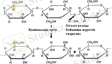 Химиялық әрекеттесудің тағы басқа түрі бұл целлюлозаны тұз немесе күкірт қышқылдарымен өңдегенде байқалады. Бұл минералды қышқылдардың әсерінен глюкозидтік байланыстарының ыдырауымен жүретін целлюлоза молекулаларының деструкциясы бастау алады, реакцияға су молекулалары да кірісіп, деструкция гидролиз процессімен қоса жүреді (Сурет 4) .