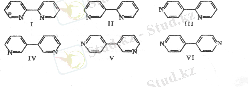 I - 2, 2'-дипиридил немесе а, а'-дипиридил; II - 2, 3'-дипиридил немесе а, р'-дипиридил; III - 2, 4'-дипиридил немесе а, у'- дипиридил; IV- 3, 3'-дипиридил немесе 3, р'- дипиридил; Ү-3, 4'-дипиридил немесе (3, ү'- дипиридил, VI - 4, 4'-дипиридил немесе у, у'- дипиридил.
