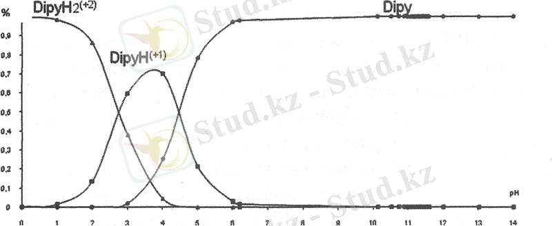 Төмендегі 7-суретте 2, 2' - дипиридилдің қышідылдық диссоциациялану константалары (рКІ=4, 4; рК2=2, 8) бойынша, рН-тың әртүрлі мәнінде протондалмаған, біріншілік және екіншілік протондалған лигандтың концентрациялары анықталып, ортаның рН-на тәуелді таралу диаграммасы келтірілген.