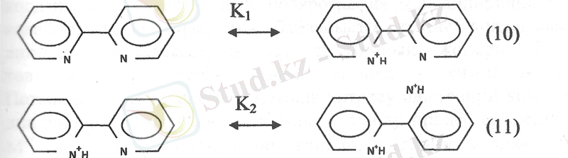 Ерітіндінің pH -ының төмендеуі мен 2, 2ʼ-дипиридилдің УК- спектрлерінің жұтылу жолақтарының ығысуына қарап, протонның бос негізге сатылып қосылады деген шешімге келген. Бірінші сатыда (10) монокатион (H + dipy ) екінші сатыда(11) дикатион(H 2 2+ dipy) түзіледі. (K 1 =3, 72*10 -5 ; K 2 =1, 66*10 -3 ) .