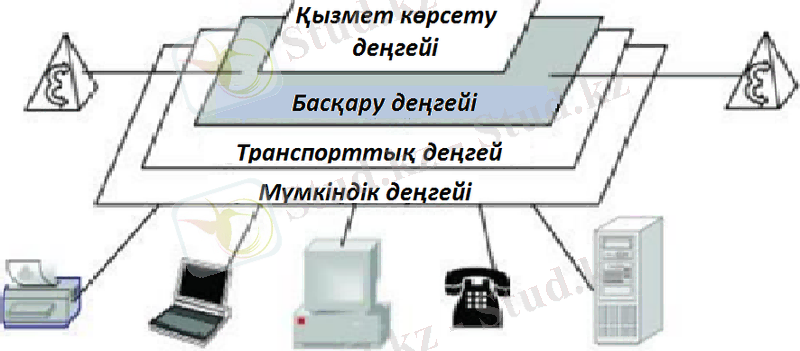 NGN желісінің типтік моделі төрт деңгейден тұрады: транспорттық, қол жетімділік деңгейі, басқару деңгейі және қызмет көрсету деңгейі (сурет 1. 2 -ге қараңыз) .