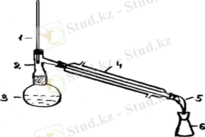 3- түбі дөңес колба, 4 - Либих салқындатқышы, 5 - алонж, 6 - қабылдағыш