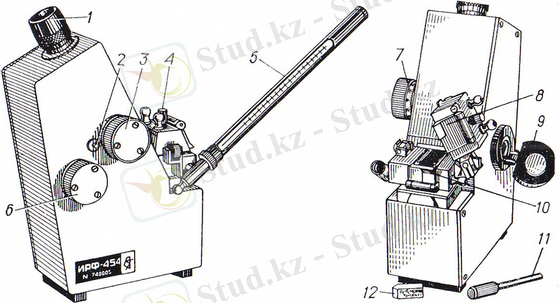 3 - компенсатор жүрісін реттейтін дөңгелек; 4 - жарық беретін призма камерасының