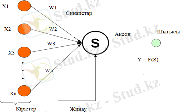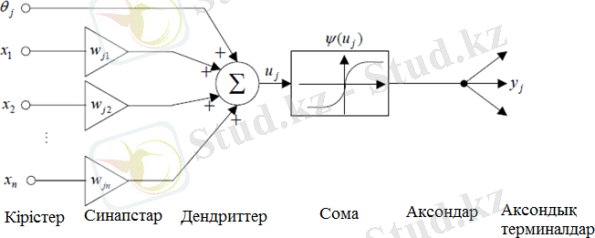Нейронның беткі жағы таралған өсімшемен жабылған - дендриттермен. Дентриттерге басқа нейрондардың аксонның аяқ жағы жалғасады. Олардың қосылған жерін синапс деп атайды. Синапстық байланыстың арқасында нейрон келіп түскен сигналға жауап қайтара алады және қандай да бір жағдайда өзінің импульсін генерациялай алады. 1. 2 Жасанды нейрондық желі Жасанды нейрон - биологиялық нейронға ұқсас болып келетін, жасанды нейрондық тордың бірлігі болып табылады (сурет 1. 2) . Математикалық тұрғыдан қарасақ, жасанды нейрон анықталу облысында шексіз болатын, бейсызық функция ретінде келетін, жалпы жағдайда кіріс сигналдарының сумматоры түрінде қарастырылады. Әдетте, бұл функция монотонды түрде өседі. Алынған нәтиже шығысына (біреу) жіберіледі. Жасанды нейрондар қандай да бір жолмен қосылып, жасанды нейрондық торды құрады. Әрбір нейрон мидың жүйке торына ұқсас болғандықтан, олардың қазіргі күйі дәл солай сипатталады. Не олар тоқтап калады, не олар қозады. Нейрон синапстық топқа ие - басқа нейронның шығысымен жалғанған кіріс байланыстар, мен шығыс байланысқа ие, бұл арқылы басқа нейронның синапсына сигнал келіп түседі. Әрбір синапс синаптикалық байланыспен немесе салмағымен w сипатталады. Бұл биологиялық нейронның эквивалентті өткізгіштігін көрсетеді [2] . Нейронның қазіргі күйі кірістерінің өлшенілген қосындысы былай анықталады.