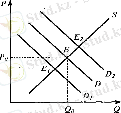 Нарықтағы тепе-теңдікті Е нүктесі десек, сұраныс көбейгеннен Д-Д2ге тепе-теңдік Е2 жылжиды