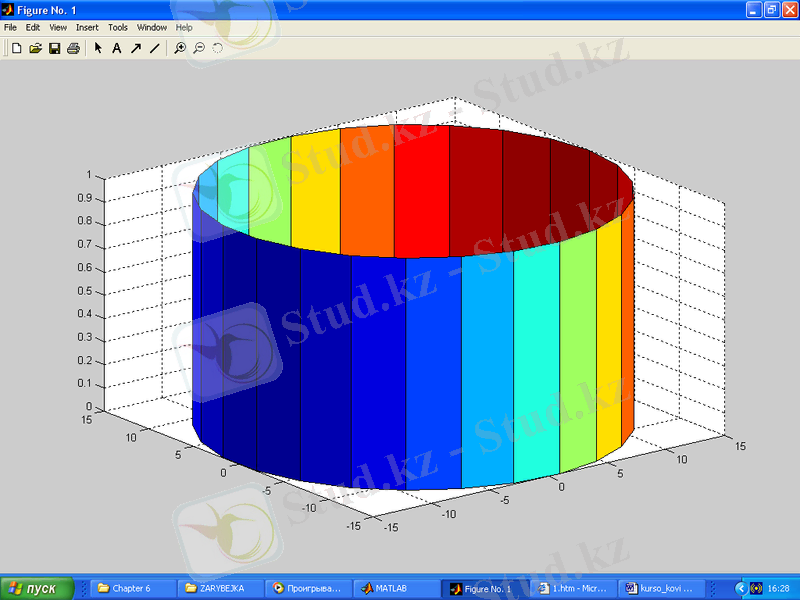 * [X, Y, Z] =Cylinder(R, N) -X, Y, Z матрицалары құрылады, R радиусты цилиндрдің қабаты құрылады және N узлдардың нүктелердің саны және surf(X, Y, Z) функциясы арқылы құрылады.
