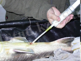 Уылдырықтың овуляцияланған жағдайға өткендігін балықтардың құрсағын басу арқылы немесе бассейіннің түбіне түскен уылдырық арқылы және генитальдық саңылаудың қызаруы арқылы біледі. Уылдырықтың бірінші порциясын қолмен сауу арқылы алады. Сосын құрсақ қабырғасын кеседі, сол кезде уылдырықтың жартысы өзінен-өзі ағады, ал қалғандарын қолмен алады. Операцияны ақырын басу арқылы 15-20 минут жүргізеді. Қалған жұмысты - тігіс салу мен уылдырықты ұрықтандырады - бір уақытта басқа жұмысшылар жүргізеді. Тіккен жер ең жақсы жағдайда 15 күн, жиі 1-2 айда жазылады. Опреацияланған аналықтардың тірі қалуы 85%.