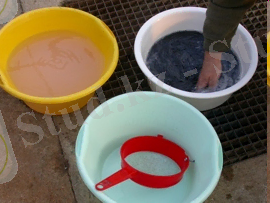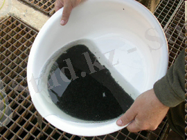 10 мл шәуетті 200 есе су мен араластырып бірден 1 кг уылдырықпен шашады. Ұрықтандыруды жақсарту үшін - ол 3 минутқа созылады, уылдырықты қауырсынмен немесе қолмен араластырып оны сумен шаяды немесе суспензиямен жабыстырады. 110л суға 150-200 г тальк немес бор, с тұзын - 15-20 г, өзен сазын - 0, 5 л құрғақ сүт -200-250 г, сүт - 2 қосады . Алынған уылдырықты суспензиямен жабыстыруды елегенде қолмен араластыра отырып немесе АОИ аппаратында 50-60 минут бойы жасайды.