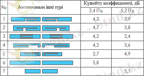 Кесте 2. 1-де сымсыз байланыс желісі антенналарына деген жалпы талаптар көрсетілген. Жұмыс жиілігі антенналардың өлшемін анықтайтын негізгі фактор болып табылады. Ұялы телефондар үшін жиілік жолағы 824-894 МГц аралығын қамтиды, ортаңғы жиілік 859 МГц-ті құраса, өткізу жолағы 8. 1%-ті құрайды. Бұл жиілік аумағында толқынның ұзындығы 35см. Бұдан ойға түйгеніміз қондырылған антеннаның өлшемі осы ұзындыққа сай болуы керек немесе шағын болуы тиіс. Мысалы, жарты толқынды дипольдың осы жиілік жолағында ұзындығы 18 см-ді құрайды. Антеннаның ұзындығы 10 см-ден ал, биіктігі - 5 см-ден аспауы тиіс. Бағытталған әрекет коэффициенті шартты түрде 3 дБ шамасында болуы тиіс. Жарты толқынды диполь үшін ол 2. 15 дБ-ді құрайды. Көптеген антенналы станциялар тік сызықты поляризацияға сай толқындар шығаратындықтан біз вертикалды сызықты поляризацияны қажет етеміз. Жоғарыда айтып кеткен талаптардың барлығына сай келетін ақпаратты сымсыз тарату желісінде қолданылатын антенналар жетерлік. Соның ішінде микрожолақты антенналар, қада (істік) тәріздес антенналар бірінші орынға ие, кейінгі орында түрлендірілген, электрлік ұзындығы сақталған инверсті типті спиралды антенналар тұр: ILA (inverted L-antenna) типті антенна, IFA (inverted F-antenna) типті антенна, PIFA (planar inverted F-antenna) типті антенна, MPIFA (meandering PIFA) типті антенналар. Осы антенналардың бірнешеуінің сипаттамалары кесте 2. 2-де көрсетілген [6] .