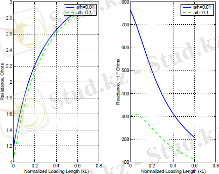Сурет 2. 4-те R ILA және X ILA кедергі мәндерінің L v / L, L v - антеннаның горизонталды бөлігінің айнымалы ұзындығына тәуелділігі көрсетілген. ILA антенналарды микрожолақты сызықтар арқылы орындаудың балама әдісі бар. Антеннаның мұндай түрлері ноутбуктарда қолданылады. Сурет 2. 4-те құрылымы микрожолақты сызықтар арқылы орындалған антенналардың күшейту коэффициентінің мәндері көрсетілген [8] .